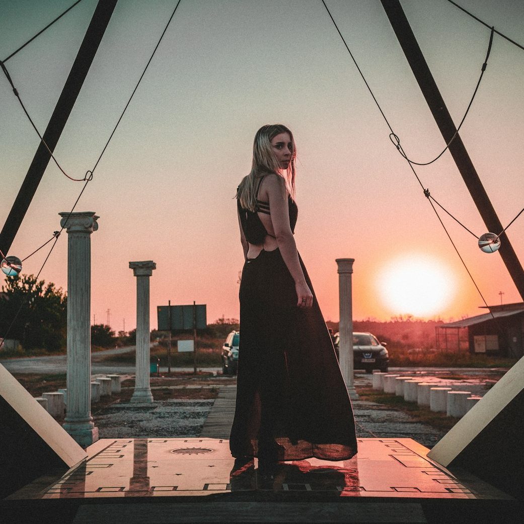 Stimmungsvoll inszenierte Abendmode vor dramatischen Ruinen-Backdrops.